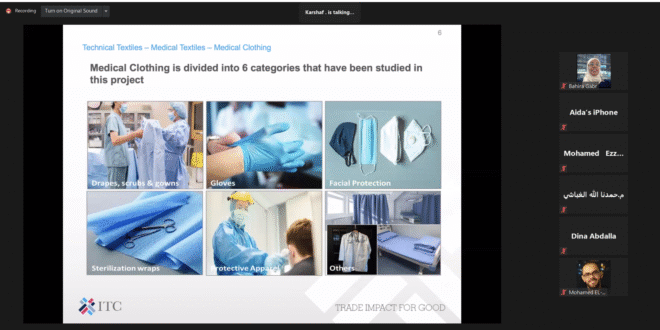 Under GTEX MENATEX Egypt; AECE participated in “Technical Textiles – Medtech Study” webinar to present the outcome of the study performed on technical textile sector with special focus on the medical apparel in order to identify growth opportunities for the sector in Egypt. The study includes the review of global Medical Textiles (Medtech) industry, mapping the sector locally, identifying opportunities and challenges for Egyptian manufacturers as well as developing recommendations to support the growth of the industry.
